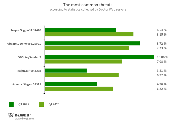 Berdasarkan statistik deteksi antivirus Dr.Web, jumlah total ancaman yang terdeteksi meningkat sebesar 16,05% pada triwulan keempat tahun 2025 dibandingkan dengan triwulan ketiga. Jumlah ancaman unik menurun sebesar 1,13%. Ancaman yang paling umum adalah adware yang tidak diinginkan, script berbahaya, dan berbagai malware, termasuk downloader dan trojan iklan.