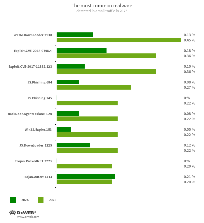 Pada tahun 2025, malware yang paling sering ditemukan dalam lalu lintas e-mail adalah trojan yang mengunduh dan menginstal malware lain. Penyerang juga mendistribusikan berbagai backdoor, exploit, dokumen phishing, dan script berbahaya melalui e-mail.