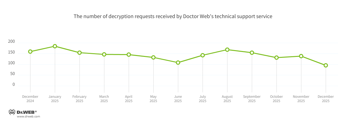 Dibandingkan tahun 2024, jumlah permohonan dari pengguna yang terkena encoder yang masuk ke Layanan dukungan teknis Doctor Web tahun 2025 menurun sebesar 35,98%. Dinamika jumlah permohonan dekripsi file ditunjukkan pada diagram di bawah ini.