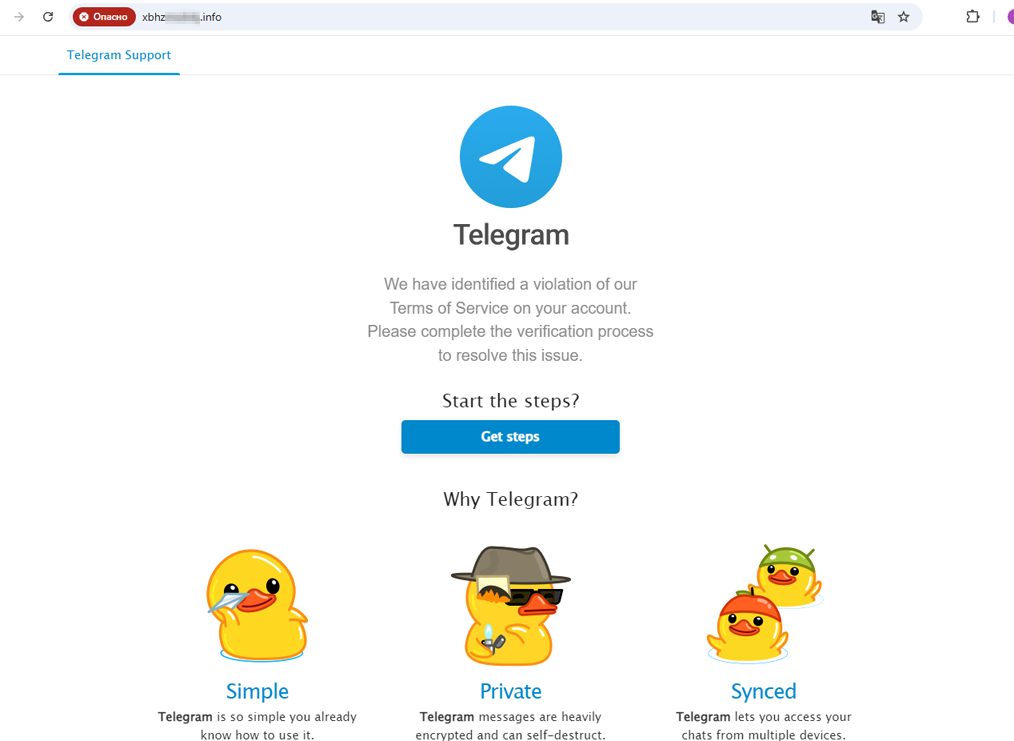 Pada tahun 2025, analis Internet Doctor Web mengamati peningkatan jumlah situs web phishing yang dirancang untuk mencuri akun messenger Telegram. Penyerang menggunakan berbagai teknik: halaman otentikasi dan otorisasi palsu, pesan palsu dari layanan dukungan Telegram yang memperingatkan tentang dugaan pelanggaran dalam penggunaan messenger dan perlunya "memverifikasi" akun, dan lain sebagainya.