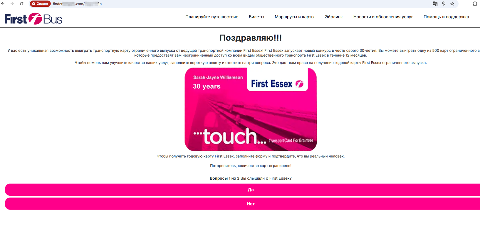 Sebuah situs web penipu yang mengaku berasal dari perusahaan transportasi, menawarkan untuk berpartisipasi dalam "undian kartu"