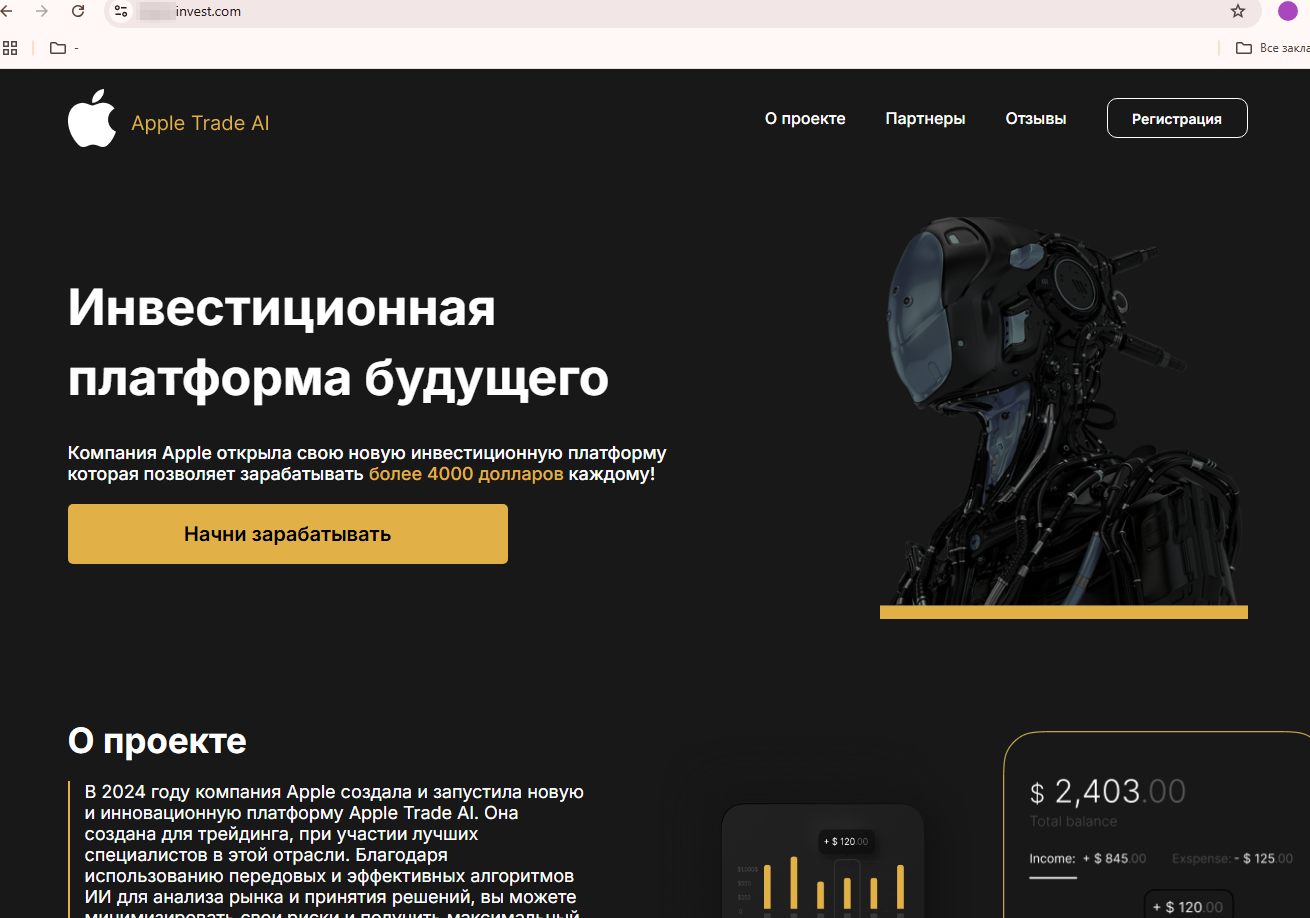 Berbagai macam situs web keuangan palsu tetap aktif. Yang populer di kalangan penipu lagi-lagi adalah situs yang menawarkan cara menghasilkan uang dengan berdagang di pasar menggunakan sistem otomatis berdasarkan algoritma unik dan teknologi AI. Situs web semacam itu ditujukan pada penduduk berbagai negara dan sering meminta informasi pribadi untuk mendaftarkan "aplikasi" atau "akun," setelah itu informasi tersebut jatuh ke tangan para penipu yang menggunakannya sesuai keinginan mereka. Mereka kemudian dapat menjual kembali data tersebut atau terus memikat calon korban ke dalam layanan investasi palsu, menuntut agar mereka menyetor dana ke dalam akun untuk "perdagangan".