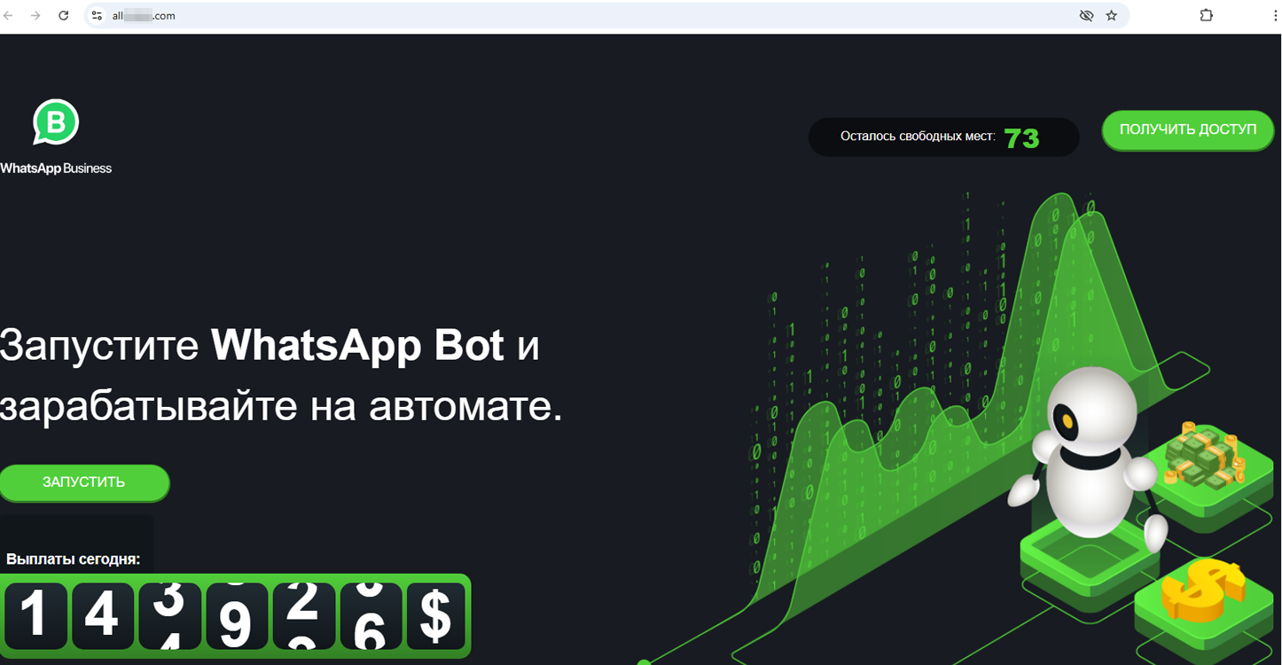 Contoh sebuah situs web yang mengajak pengguna untuk menggunakan bot perdagangan yang sebenarnya tidak ada, yang seolah-olah berkaitan dengan messenger WhatsApp