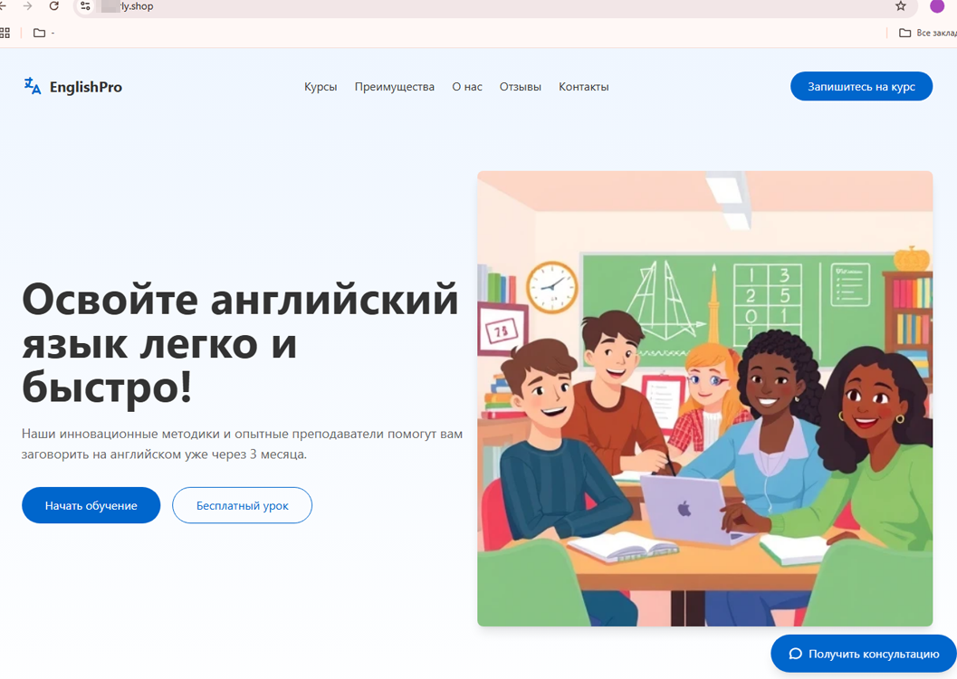 Salah satu situs web penipuan tersebut menawarkan kursus untuk menguasai bahasa Inggris