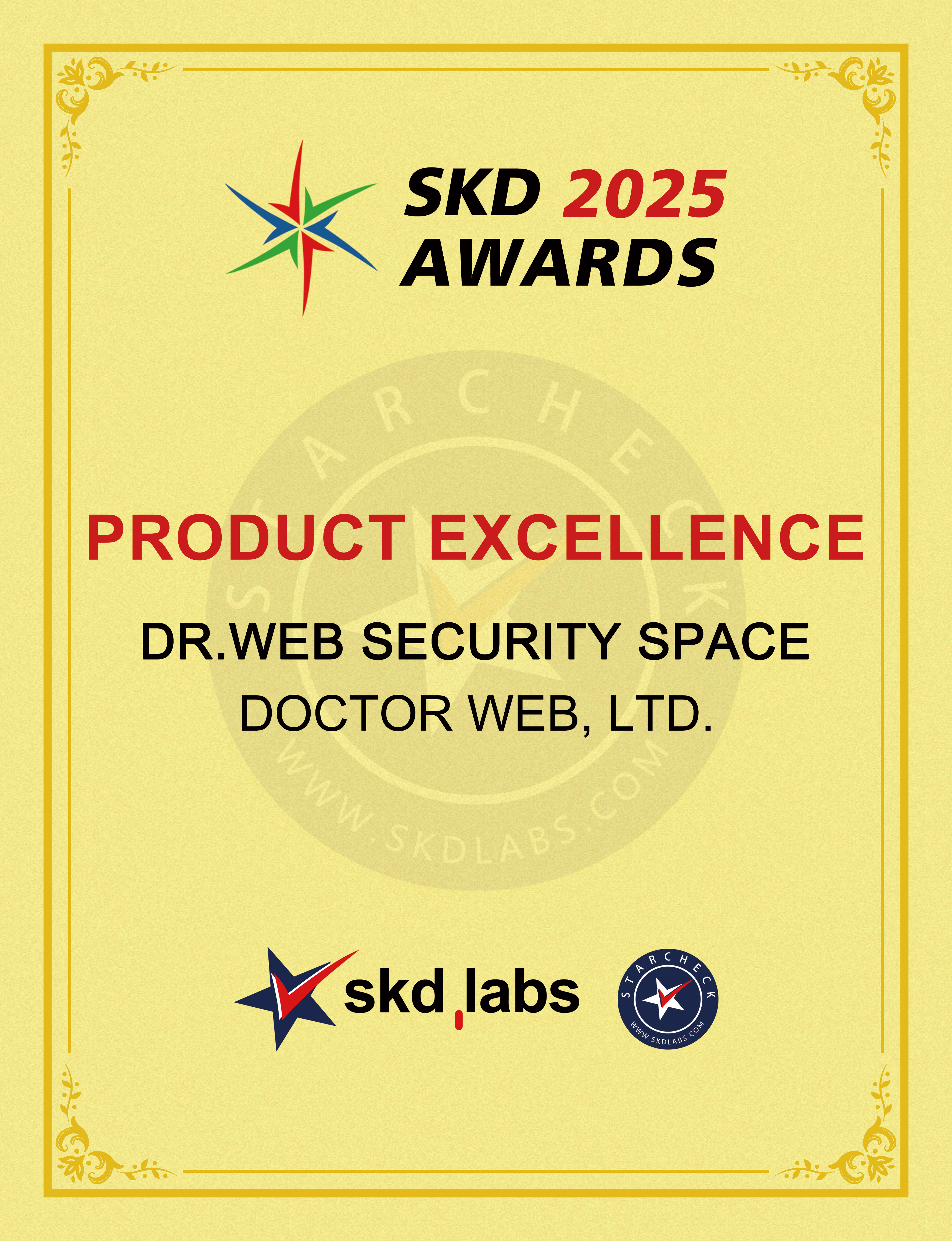 Solusi perlindungan komputer pribadi Dr.Web Security Space sekali lagi berhasil meraih penghargaan industri bergengsi, SKD AWARDS. Dr.Web Security Space dinobatkan sebagai yang terbaik dalam kategori "Antivirus untuk PC".