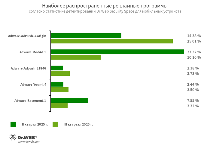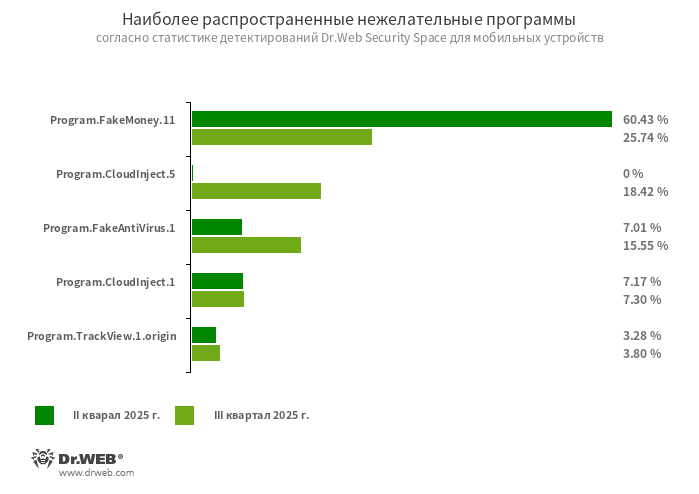 Berdasarkan data statistik deteksi Dr.Web Security Space untuk perangkat mobile, pada triwulan ke-3 tahun 2025 malware yang paling sering ditemukan adalah trojan Android.MobiDash yang menampilkan iklan yang mengganggu. Dibandingkan periode sebelumnya jumlah deteksi trojan ini pada perangkat yang dilindungi meningkat 18,19%.